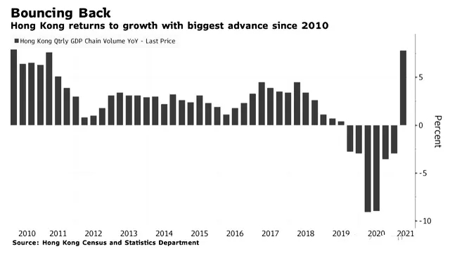 香港首季GDP增长7.9% 结束连续六个季度收缩情况